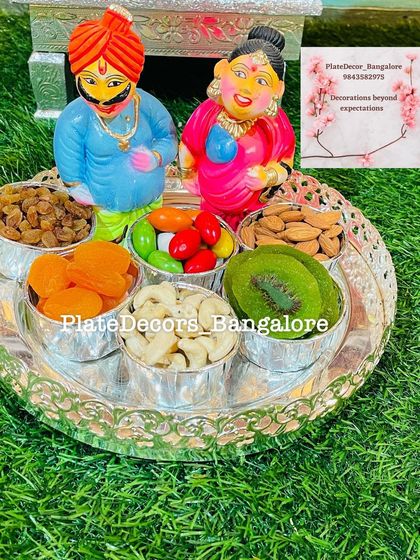 Make your wedding gifts unforgettable with custom decorations. I create platters featuring traditional Marapachi Bommai, personalized couple cutouts, and elegant ring holders for your engagement ceremony.