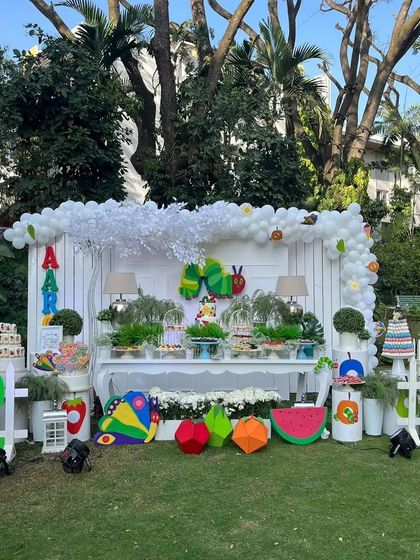 - I go big with themed backdrop installations: think a giant Hungry Caterpillar, a T-Rex head busting through “jungle” walls, or a superhero city full of skyscrapers.