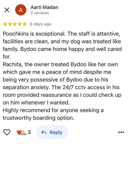 Log poochte hain, how do we manage so many dogs? Sach kahun toh, humara dil hi itna bada hai. Shiva, Angel, Chunchun, Buddy – har ek ka apna story hai. Hum mana hi nahi kar paate. Even street dogs know our car – waiting for food and love. Wo bhi toh humare hi bachche hain. Pet parents say their babies enjoy here more than at home. For us, Poochkins is full of wagging tails, masti, and endless paalu-paalu.