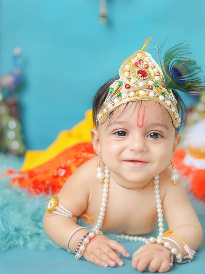 Let's dress up your little one as the playful Kanha or graceful Radha. I create vibrant, traditional setups with peacock feathers, flutes, and matkis to capture their divine innocence and mischievous smiles. These sessions are perfect for celebrating our culture and creating truly special memories.