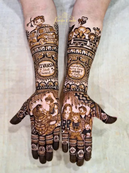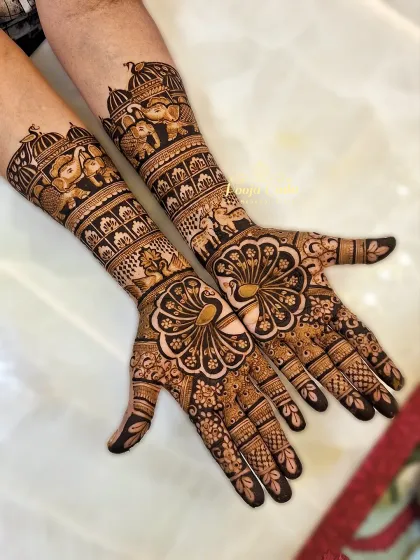I design bridal mehendi based on your story, including portraits, custom elements, and tattoo cover-ups, and I travel for weddings in India and abroad.