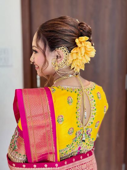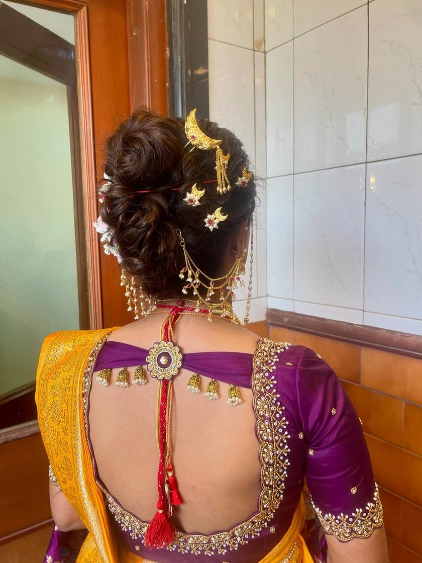 A bridal look is incomplete without the perfect hairstyle. I specialize in a range of hair artistry, from classic updos and romantic waves to intricate braids and the traditional Maharashtrian Khopa, all adorned beautifully to match your attire.