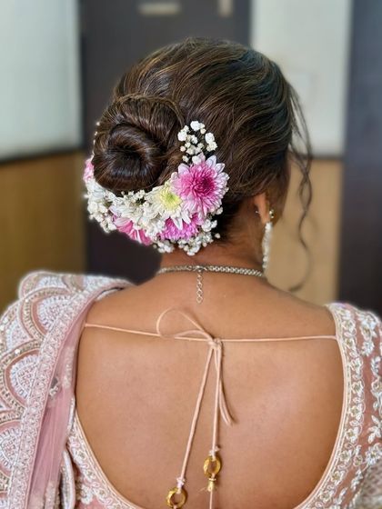 Your hairstyle completes your look. I offer a wide range of hairstyling services, from classic floral buns and intricate braids for traditional ceremonies to soft, romantic curls and chic ponytails for your reception or cocktail night. We will work together to find the perfect style for you.