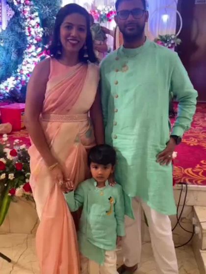 - Father: Modern festive wear such as Drape Kurtas or Asymmetric Hemlines designed to complement the Mother's silhouette.