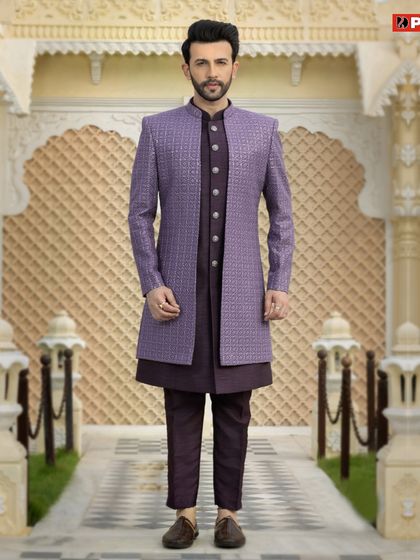 - Sherwani Coat: Knee to calf length coat in Art Silk, Jacquard, or Velvet blends. Features machine embroidery designed to mimic hand Zardosi work.