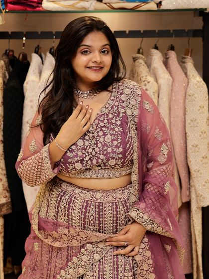 My lehenga collection features a variety of styles, from heavy bridal and sangeet lehengas to lighter, trendy options for guests. Find outfits in different colors like deep blues, vibrant pinks, and multi-color prints, all available to rent.