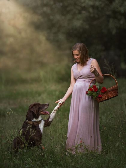 I offer maternity photography in studio or outdoor settings, include family and pets, and deliver finished images in my painterly style—no raw files, just color and black and white photos.