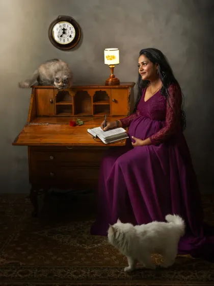 These sessions are for those who desire timeless, intimate portraits with a fine art feel. I use moody backdrops, classic lighting, and curated vintage props like antique desks and lamps to create images that look and feel like paintings.