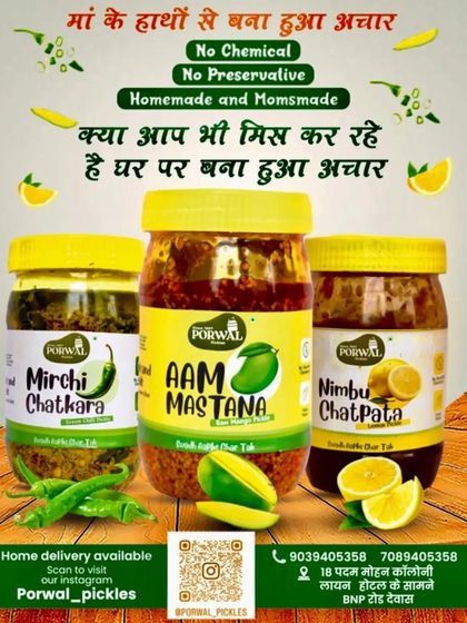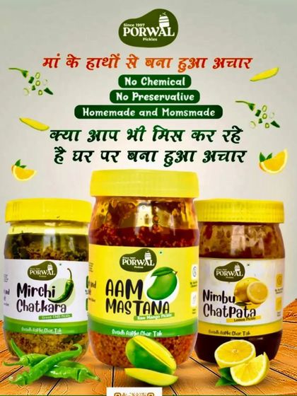 Namaste, hum Porwal Pickles. Dewas ke log hume Pickle Perfectionist bulate hain, aur sach kahun toh har jar mein hum apni dadi-nani ka swad bharne ki koshish karte hain. 1997 se yeh silsila chalu hai. Jab koi bolta hai 'ghar jaisa taste', toh lagta hai mehnat safal hui. Har achar mein pyaar aur parampara milti hai, kuch recipes toh 50 saal purani bhi hain. Porwal Pickles - har bite mein ghar ki yaad.