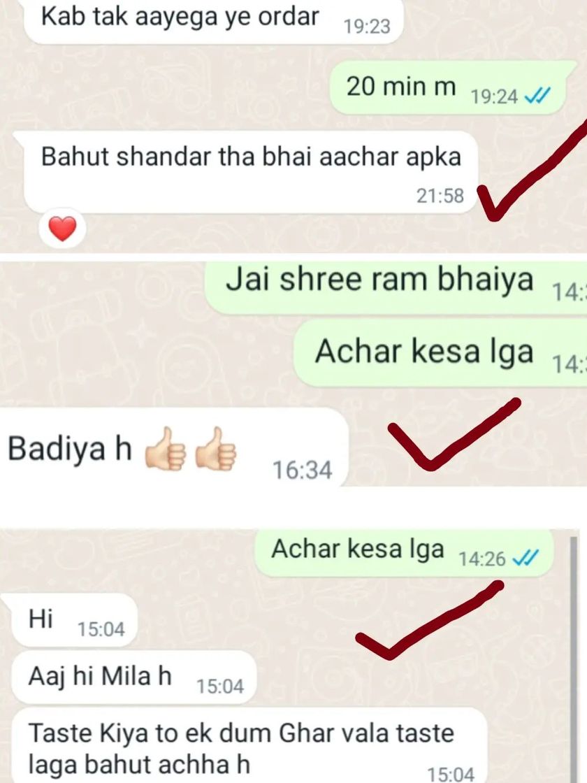 Nothing makes me happier than hearing that my pickles and murabbas remind people of home. Here are some kind words from customers who are enjoying the authentic 'ghar ka swad'.
