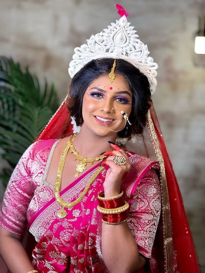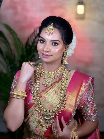 I do bridal and party makeup that lasts through Mumbai weddings, covers all cultures, suits every skin type, and includes hairstyling, draping, and jewellery rental so you get everything in one place.