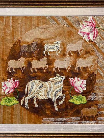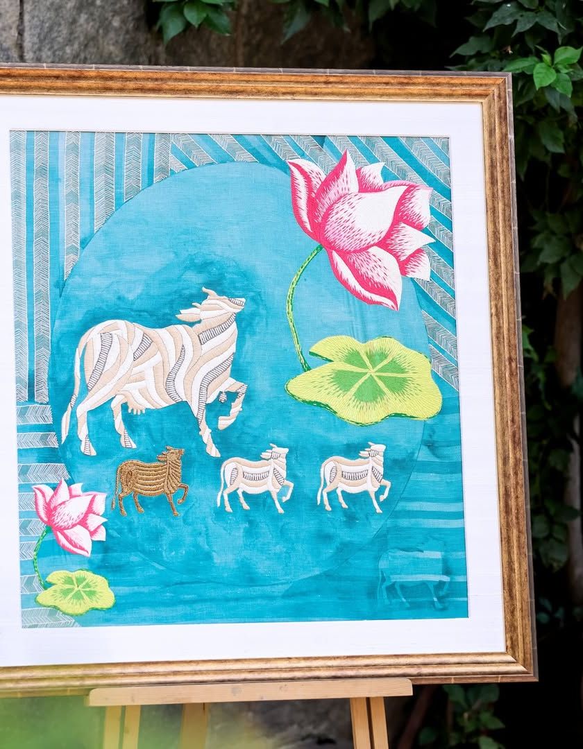 I draw deep inspiration from my Rajasthani and Jain roots, reinterpreting traditional stories like Pichwai and symbols like Nandi and Kamadhenu for the modern home. These works, in both paint and thread, are my way of keeping these sacred stories alive.