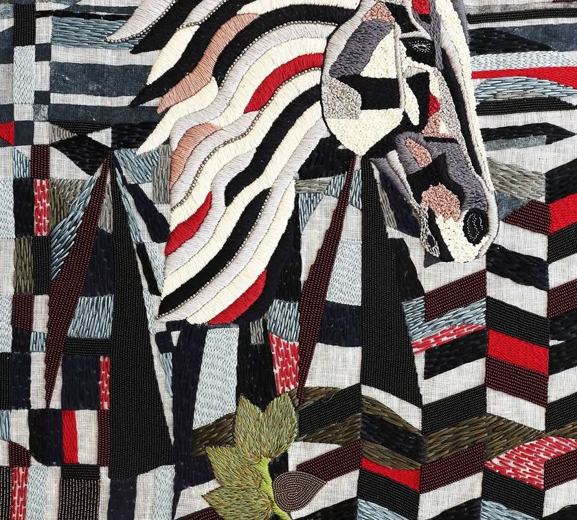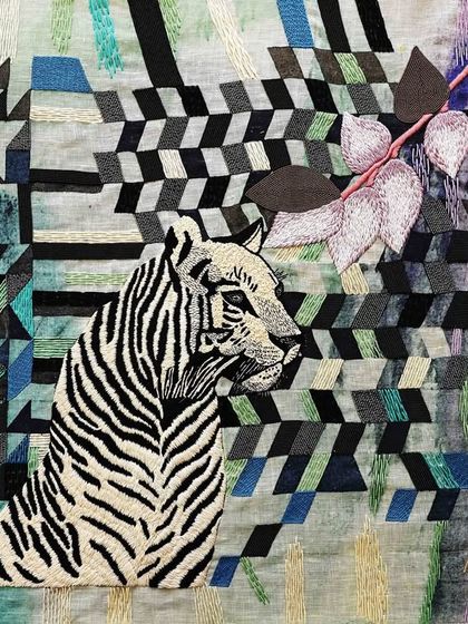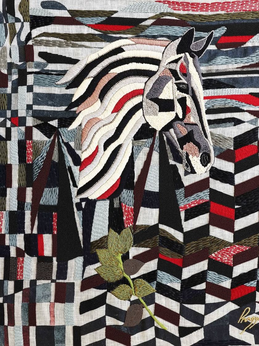 This collection celebrates animals as the true protagonists of their world, deserving of peace and freedom. Each piece is a slow, meditative process of hand embroidery, using Zardozi, beads, and intricate threadwork on linen to create textured tapestries that take months to complete.