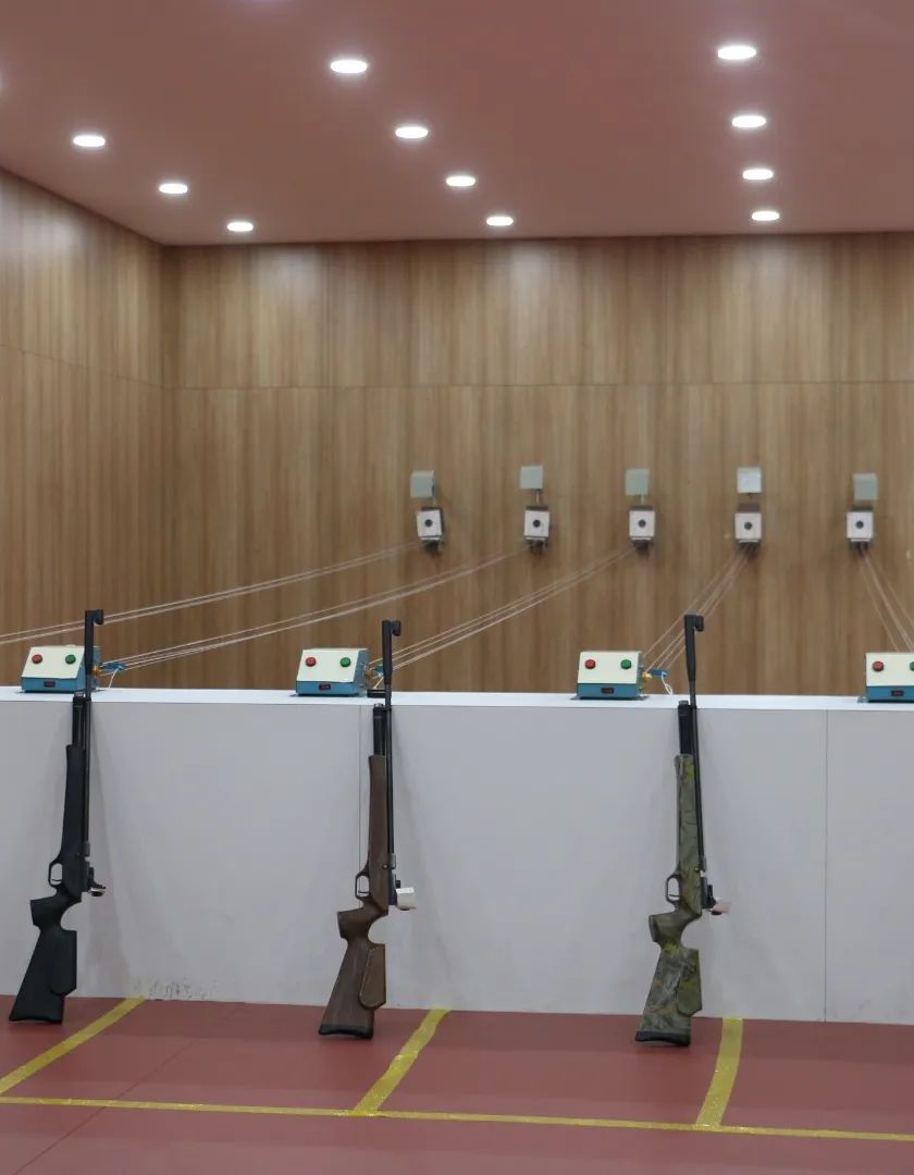We offer a professional, fully air-conditioned shooting environment built to International Shooting Sport Federation (ISSF) standards. You will train with authentic Olympic-grade air rifles and pistols, and our facility also includes a gym and yoga area to support holistic development.