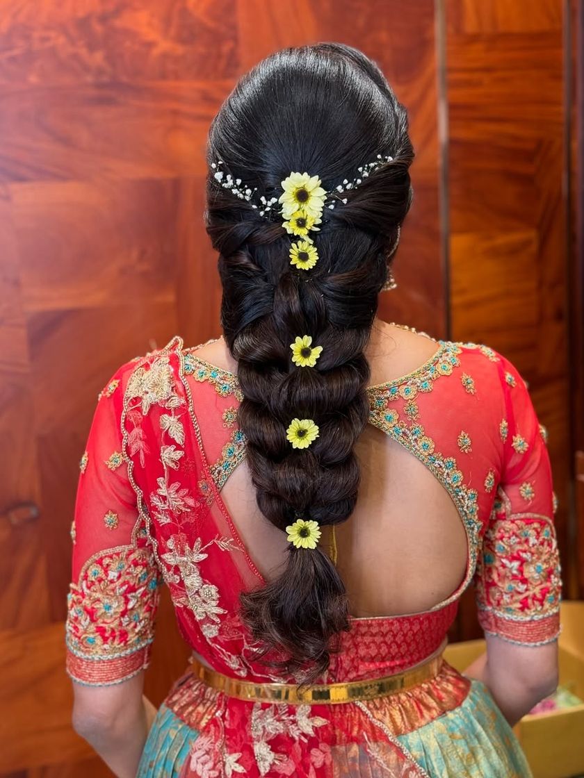 A bridal look is incomplete without the perfect hairstyle. I am an expert in creating a wide range of hairstyles, from traditional South Indian braids adorned with flowers and jewels to elegant updos and modern, romantic waves. This gallery showcases the detail and craftsmanship that goes into each style, ensuring it complements your look and stays perfect throughout the day.