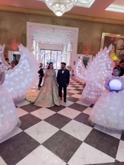 Let's create a completely unique experience with a themed entry. This Angel theme, featuring performers with glowing wings and orbs walking on a cloud of fog, is just one example of how I can bring a creative concept to life for a truly one-of-a-kind event.