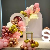 We create sophisticated backdrops for milestone birthdays and other celebrations. Setups feature custom arched panels with personalized names, marquee numbers, and coordinated balloon decor in various color palettes, from soft pastels to rich metallics.