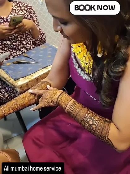 See my team and me in action, applying mehndi with care and precision. We offer a free trial and home service across Mumbai, so you can be comfortable while we create your design.