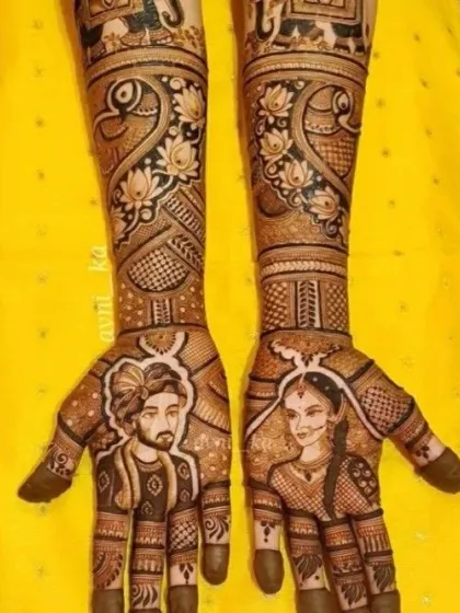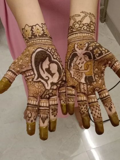 I specialize in creating clear and recognizable portraits in henna. Whether it's the bride and groom, beloved family members, or even deities, I draw each face with precision to bring your vision to life. This is a perfect way to honor the people who matter most to you.