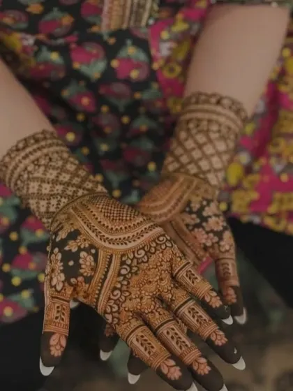 We create stunning, full-coverage mehndi for brides who want the absolute best for their wedding day. Our designs include detailed work with peacocks, lotuses, and jaali patterns, and we promise a deep, dark henna stain.