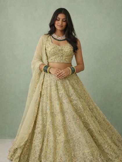 Discover my collection of sophisticated lehengas in soft pastel shades like lavender, mint, and dusty rose. These outfits feature delicate embroidery and are perfect for engagements, day weddings, or reception parties.