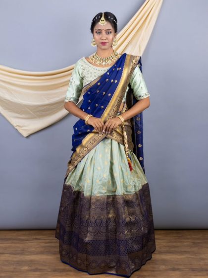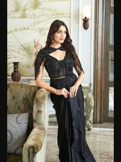 Make a statement at your cocktail or reception party with these modern Indowestern styles. Choose from chic pre-draped sarees, glamorous gowns, and stylish crop tops with ruffled skirts in bold colors like black and navy blue.