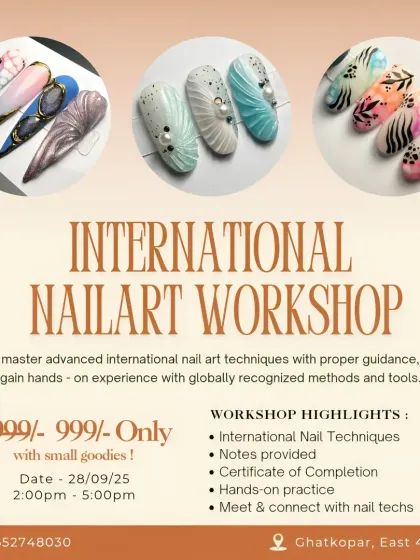 I teach small, hands-on nail art workshops where you learn real techniques, get all materials, and leave with a certificate and business tips.