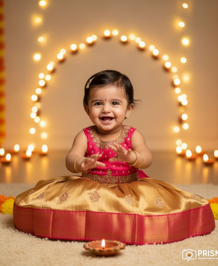 We capture the joy and tradition of Indian festivals with themed photoshoots. From the glow of Diwali diyas to the vibrant spirit of Durga Puja, we create beautiful memories of your little one's first celebrations.
