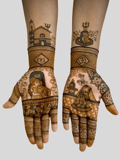 Bridal mehndi for me is all about making your wedding story visible. I love creating personalized mehndi designs - your love story, your favourite moments, even the Dulha-Dulhan (bride-groom) portraits. Want the baraat or doli scene? I can add that. I sneak in the groom’s name somewhere, so finding it turns into a fun game. My go-to style is super fine, detailed traditional Indian bridal patterns like peacocks and jharokhas.