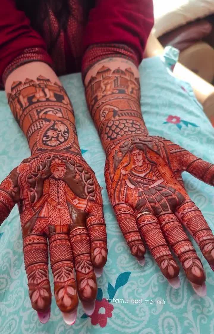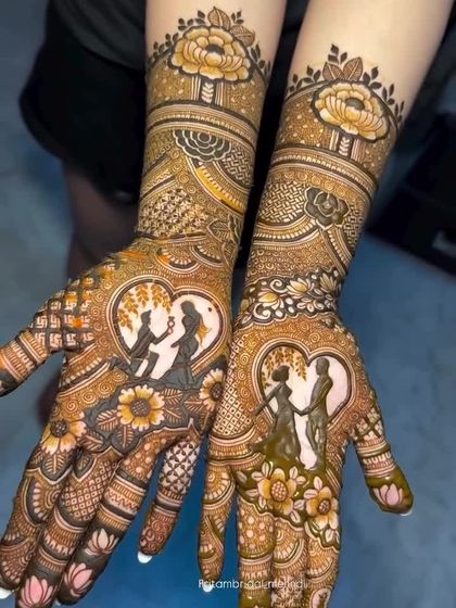 Your hands can tell your love story. I specialize in creating custom portraits of the bride and groom, and weaving scenes from your journey together, like the proposal or jaimala ceremony, into your bridal mehndi.