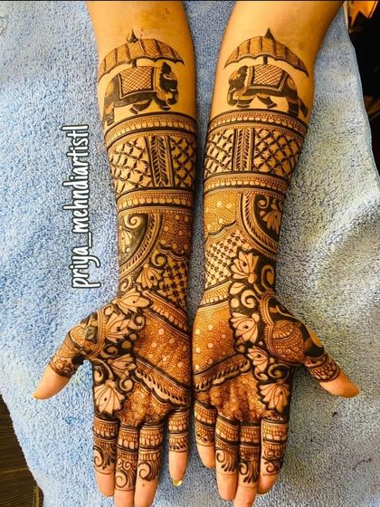 My specialty is creating intricate, full bridal designs that cover both hands up to the elbows. Each design is packed with detail, using fine lines and careful shading to create a masterpiece for your big day.
