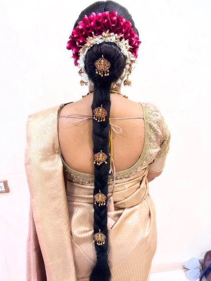 - Full bridal package: HD bridal makeup (from natural bridal makeup to bold glam), professional hairstyling (buns, braids, updos, gajra), and saree or dupatta draping. I’m obsessed with the perfect Maharashtrian bridal look, especially that neat nauvari drape (chapoon chopoon nesleli nauvari).