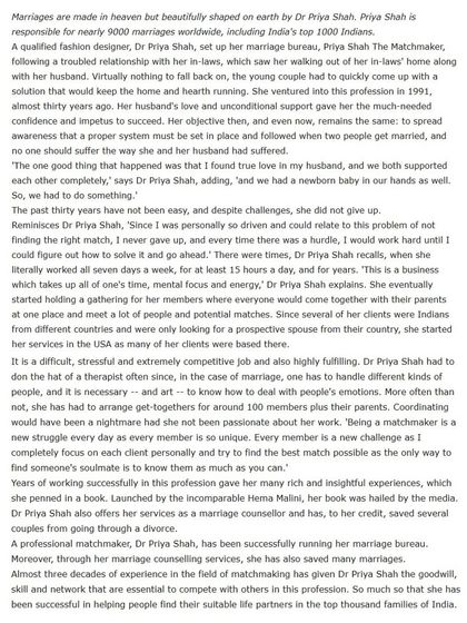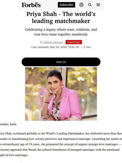 My work and philosophy have been featured in some of the world's most respected publications. These articles highlight my journey, my unique approach to modern matchmaking, and the trust I have built with high-net-worth families and global Indians over 34 years. This is a testament to my reputation as India's No. 1 and World's No. 3 matchmaker.