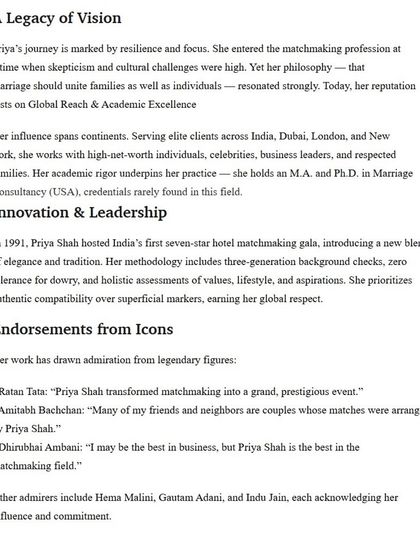 My journey began in 1991, inspired by my own arranged marriage and a desire to give others more choice. From a social service to a globally recognized elite matchmaking firm, this is the story of my passion for creating happy families.