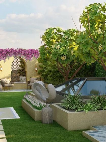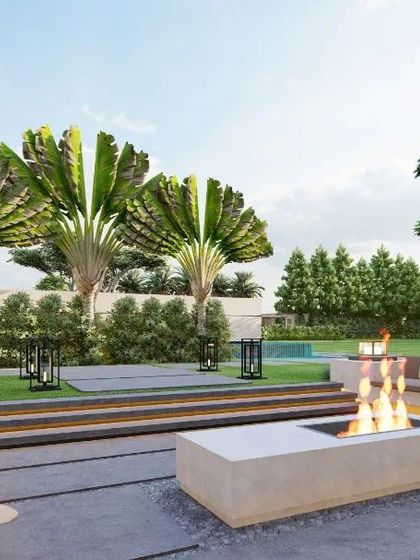 We specialize in creating harmonious outdoor spaces across residential, commercial, resort, and farmhouse projects. Our designs integrate natural elements like palm avenues, water features, and lush greenery with modern amenities such as sunken seating areas and wooden decks.
