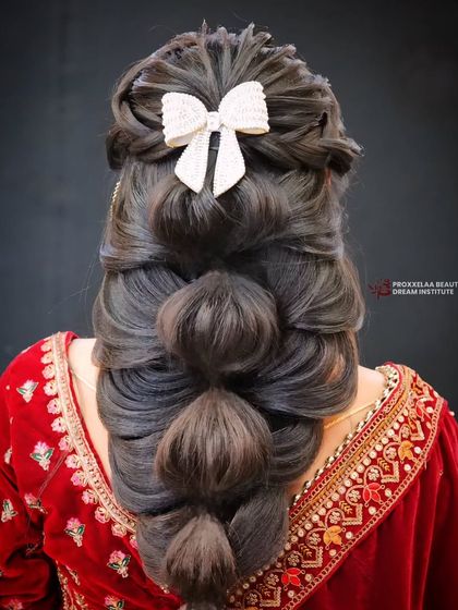I love getting creative with braids and ponytails that are anything but basic. This is where we play with texture, volume, and accessories like pearls and bows to create a truly unique look. These styles are perfect for when you want something special for a sangeet, festival, or party.