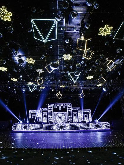 - Ceiling: Installations like disco balls or geometric neon structures over the dance floor.