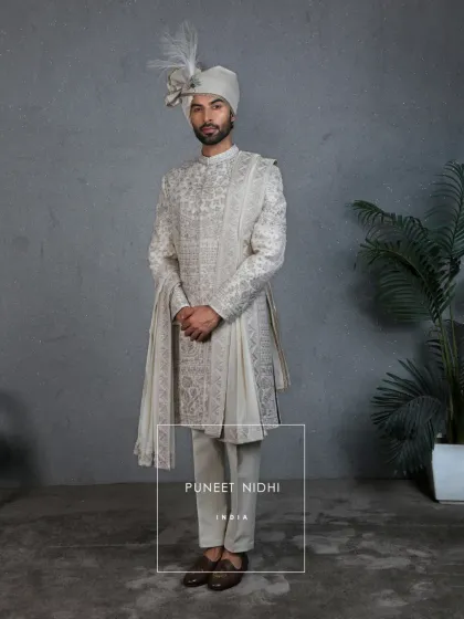 I’m Puneet Nidhi. For me, every sherwani or achkan is not just clothes – it’s a memory stitched with Mughal vibes, arches, domes, all that old-school charm. I love mixing tradition with today’s style. My work is about making wedding wear that feels like family history you can wear. Not just for the big day, but for passing down. Heritage, emotion, and a bit of drama – that’s my jam.