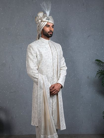 We craft heirloom men's ceremonial wear where Mughal-inspired artistry is translated into sharp, modern silhouettes. Each piece is a masterpiece of handcrafted detail, from intricate zardozi to resham embroidery.