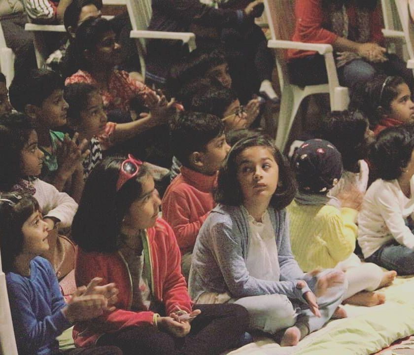 There is nothing like the energy of a live performance. We perform everywhere from intimate home terraces and art galleries to large school auditoriums, bringing the complete setup to create a magical atmosphere. Watch how audiences of all ages get lost in the world of our stories.
