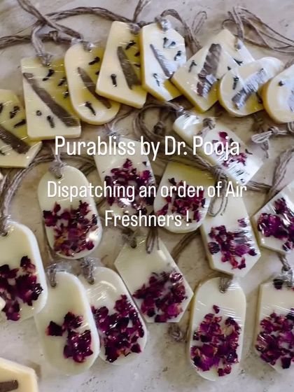 We create handmade air fresheners using pure soya wax, beeswax, and essential oils. Our signature scents include Rose Cedarwood and Cinnamon Clove, designed specifically for small spaces like wardrobes and shoe racks.