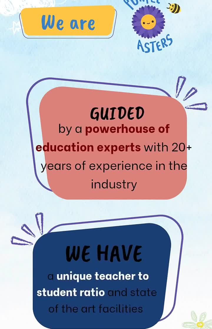 We are now welcoming new little Asters for our Preschool and Daycare programs. We offer a unique curriculum based on Multiple Intelligences for Pre-Nursery, Nursery, LKG, and UKG with flexible timings to suit your family's needs.