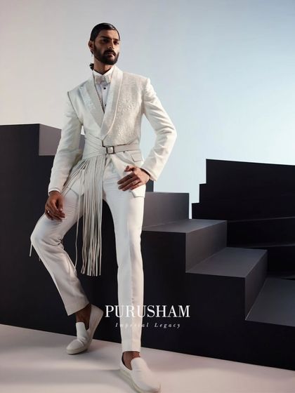 - Silhouette: Innovative cuts such as Bandhgala with drapes, Asymmetric Achkans, or Belted Open Jackets.