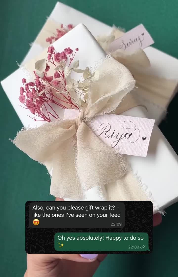 A beautiful gift deserves beautiful presentation. I offer custom gift wrapping to complete your personalized item, using high quality papers, delicate ribbons, dried florals, and custom wax seals to make the unboxing experience as special as the gift itself.