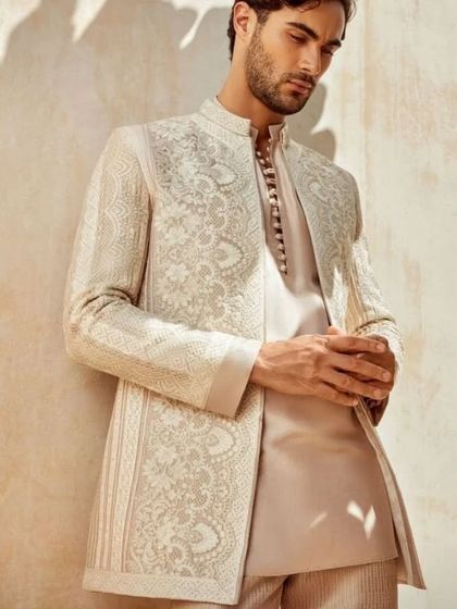 - Designer sherwanis for grooms, family ya best friend - heavy embroidery se leke subtle pastels tak, aur matching turban bhi ho toh kya baat hai.