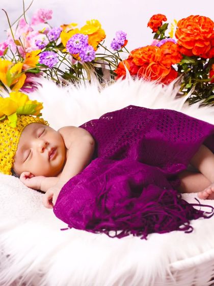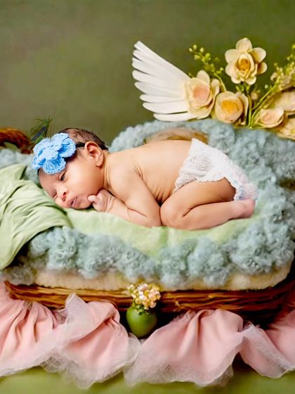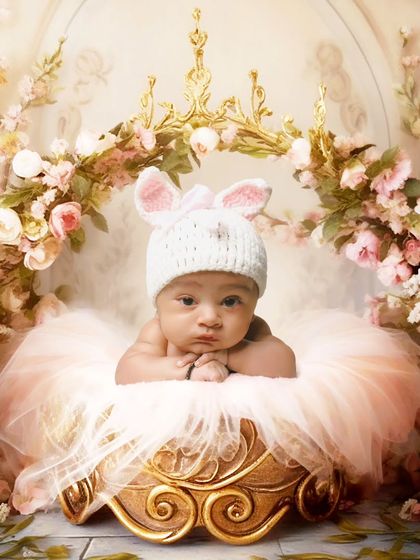 We specialize in creating soft, whimsical portraits of your newborn in the comfort of your home. Our sessions feature creative themed setups with carefully selected props like baskets, plush toys, and floral arrangements to enhance the natural beauty of your little one.