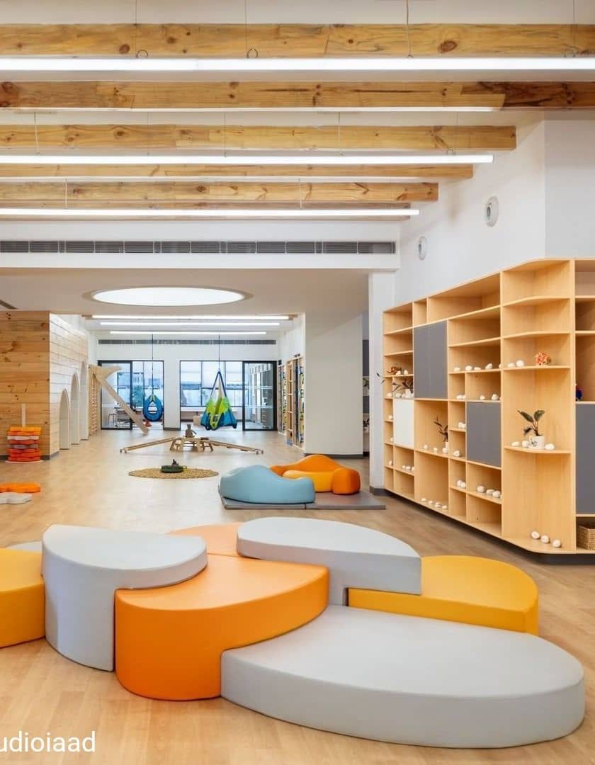 Our school designs are centered on movement, growth, and experiential learning, following philosophies like those of Sri Aurobindo. We create spaces with open centers, abundant natural light, and modular elements to provide a stimulating environment where children can learn and play.