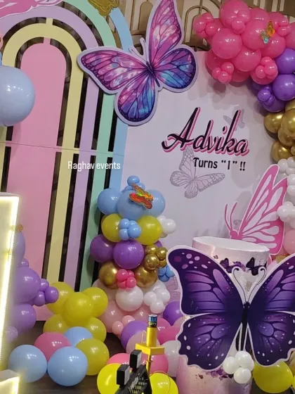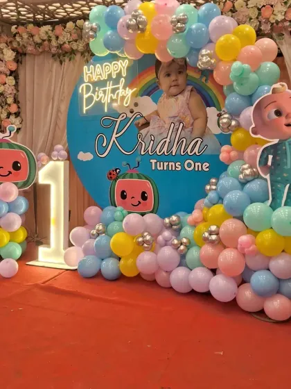 Kids ke liye full themed setup milta hai - Cocomelon, Butterfly, Football, Doraemon - jo bhi chahiye. First birthdays pe marquee number '1', photo collage, custom backdrop - sab milta hai.