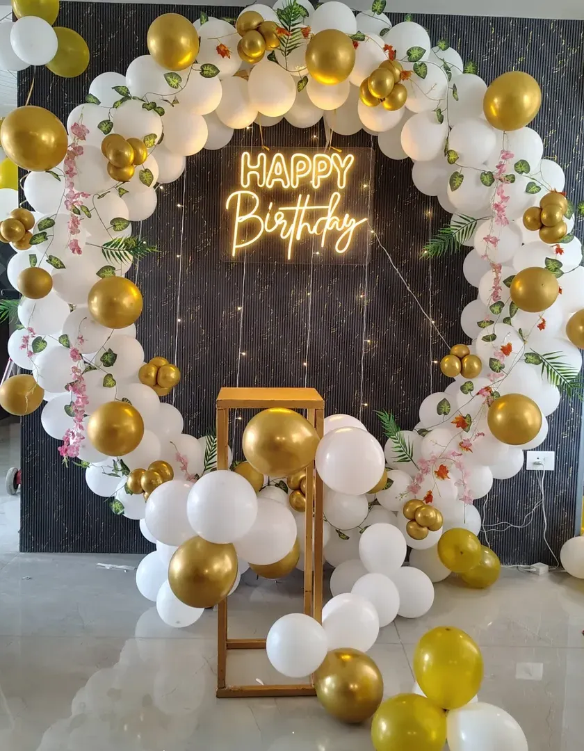 I specialize in creating stylish photo backdrops for adult birthdays, anniversaries, and other celebrations. These setups often feature circular frames with balloon garlands and custom neon signs, perfect for making your event photos stand out.
