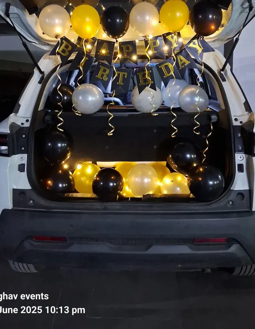 Plan the perfect filmy surprise with a decorated car boot. I fill the car dickey with balloons, lights, and banners for a memorable birthday or proposal moment.